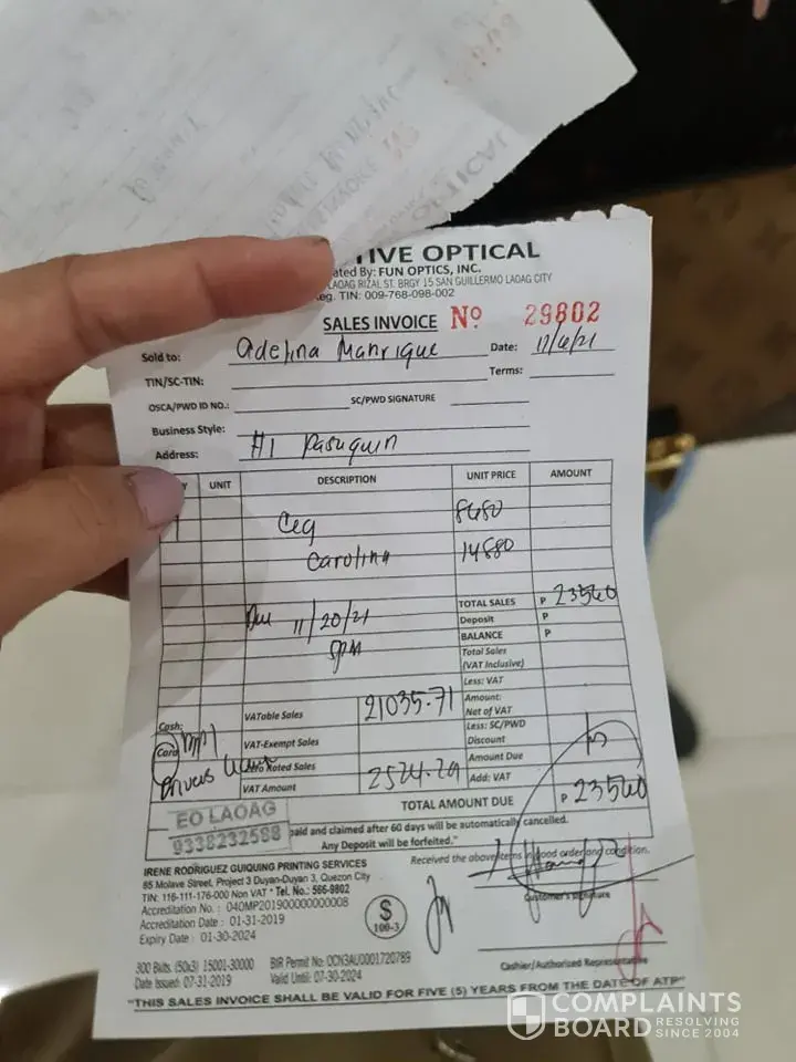This was on November 6, 2021. The store was at Puregold Laoag. I paid 23, 560 pesos for the frame and customized polarized lens (Sales Invoice No.29802). November 15, 2021 they texted me to get the item purchased, when I received the item it was not that polarized thing that I expected, it doesn't even change color under the sun. So I ask the person in the store, she said they ordered it OUTSIDE EO Laboratory so they can't do anything about it. I ask them to change it or make it to a transition lens so I can still use it on work but they insist me to pay additional money. What can I do to have a refund on it?