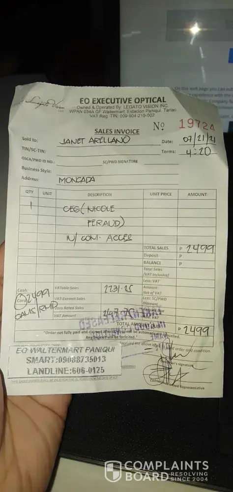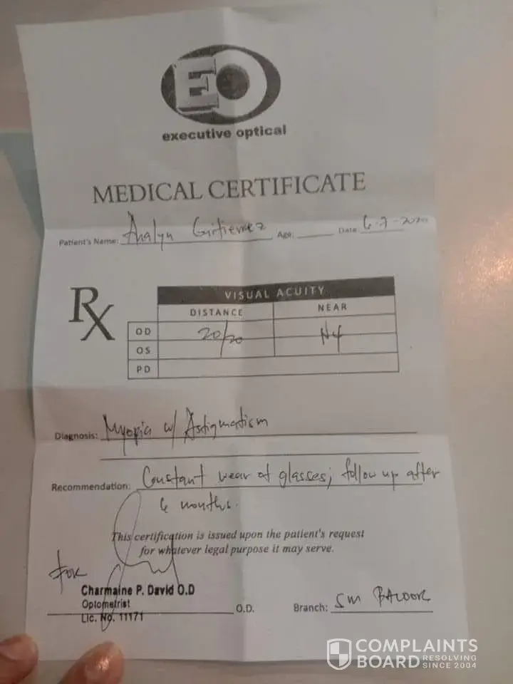 I would like to raise my concern regarding my medical certificate issued on me, last january 11, 2021, I went to eo optical sm bacoor branch to request for a medical certificate, I talked to the manager whose name is jovy paragas and asked her if I can get a medical certificate as a requirement for pwd id application, I told her that i've purchased a pair of contact lens there last year and already had a medical record then and I believe that my eyes has an 700 to 800 level, but she said that they can issue a certificate and insisted that I have to purchase a new one first before I can get a certification, I answered her that the one I bought is still good until june 2021 (1year) so I dont need to buy a new one, I waited a couple of minutes until she came back and handed me a certificate. Which does not indicate my actual reading vision based on their records. I asked her why is that my records does not reflect in the certificate and she said "yan lang ang pwede namin ibigay", she didn't even gave me an explanation. And the one who signed below is not the optometrist itself, in my frustration I left there with so much disappointment. It will came out that I had a wrong diagnosis and cant be qualified for pwd id. Please see below details of certificate.