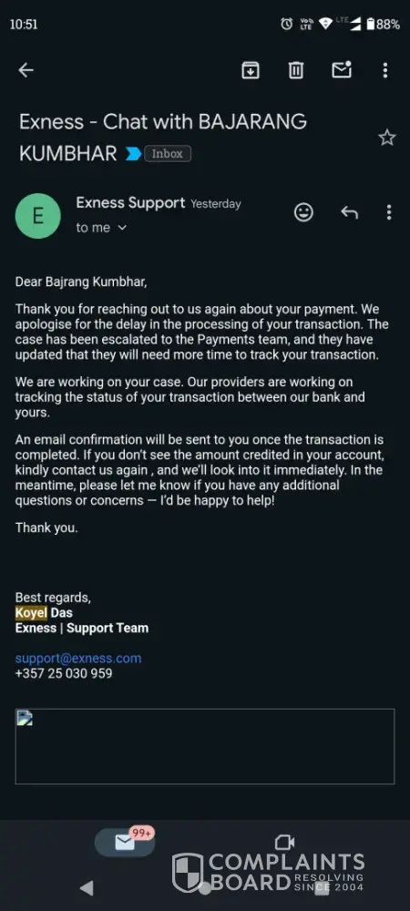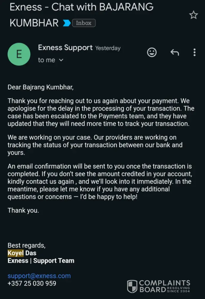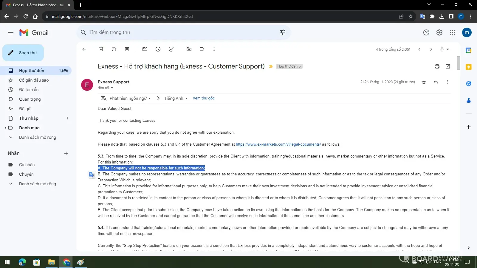 23th October send and email to exness support, this email never replies and there is no live agent available to chat with