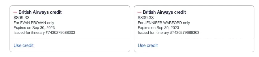 Travel was cancelled because of visa issue. Credit notes for 2 tickets costing $809.33 each were issued, to be used by September 30th 2023.