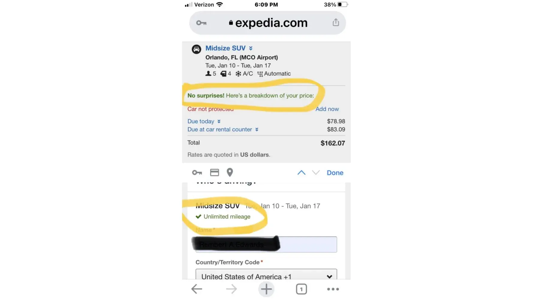 On January 3rd, I went on the Expedia website looking to rent a car to drive to Georgia to take care of my mother’s estate who recently passed away. Under the duress of dealing with my mom’s death, I planned my trip. I was pleased to find a Midsize SUV for a weekly rental on the Expedia website that was within my budget. The website stated in bold green letters, “No surprises! Here’s a breakdown of your price: Due today - $78.98; Due at car rental counter - $83.09 and the total amount for the week would be $162.07. It also stated beside a bold green check mark (Unlimited mileage). [I have the screenshots that I can provide you with that shows all of this]. With the above information, I booked the rental.