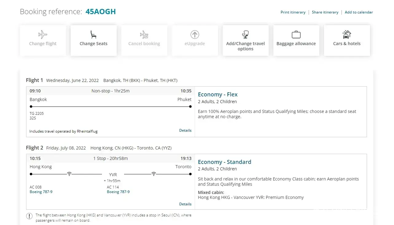 Expedia alerts us that the airline Air Canada had cancelled the flight Toronto-Hong Kong and rerouted us to fly Toronto-Vancouver-Hong Kong-Phuket instead.