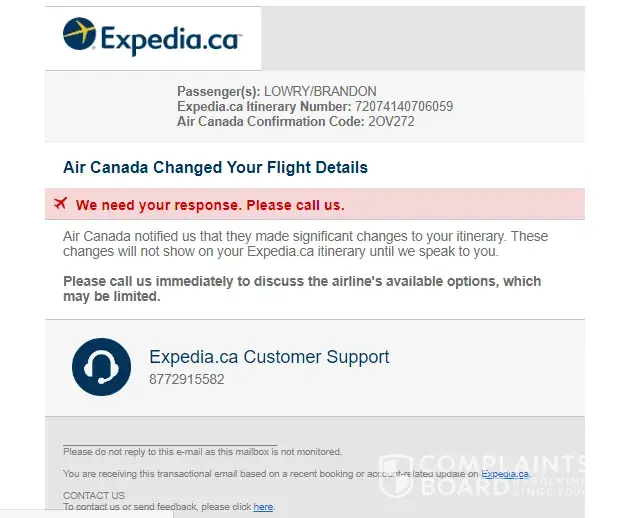 I have received an email from expedia.ca regarding flights I had booked. It read "urgent" contact us immediately. I have been trying for 6 days spending up to 6 hours on hold at a time.