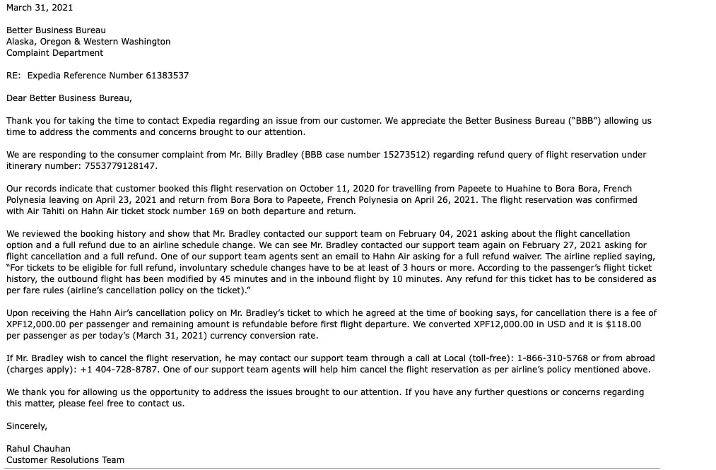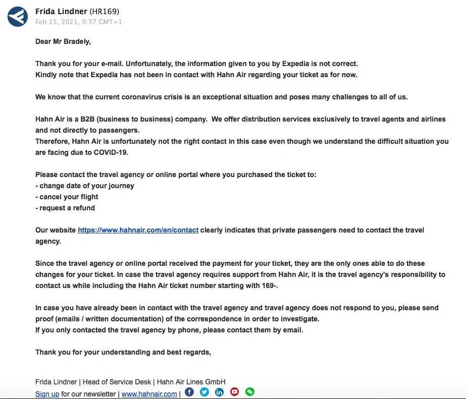 Due to the global pandemic it is impossible to make my flight that I purchased through Expedia on October 11, 2020. I asked them for a refund. I got the usual where they say they will contact the airline and get back to me. I waited 2 weeks and did not hear anything. I contacted Hahn air and they responded saying that Expedia never contacted them. They did say that they are a Business to Business Company, so Expedia would have to issue the refund request. I contacted Expedia again. They told me they would look into it. Again I did not hear from them in a timely manner. I then filed a complaint with the BBB. After almost a month Expedia responded. Their Customer Resolution member told me that Hahn air would only issue a refund if my flight time was involuntarily changed to 3 hours or more and that mine was not. They said I could pay a penalty of $118 and get the remainder refunded and to contact them if that is what I wanted to do. I called them that day and was on hold for 2 hours. They finally took my call and then put me on hold for another hour then the call disconnected. I gave them a couple of days to see if they would contact me. They did not. I called them again and explained the whole situation again. They told me they would push this to their support team. 3 days later I get a short email telling me that Hahn air is sticking to their fine print agreement that I agreed to when I purchased the ticket. My flight time has now been involuntarily changed by 3 hours and 15 minutes so I called Expedia back. They told me that Hahn air is not issuing any refunds to anyone but they are issuing credits. I told them about the email I got from their Customer Resolution stating that I could get a refund. They told me they would look into it and get back to me. I have not heard from them about this.