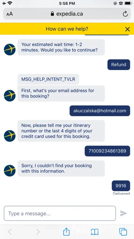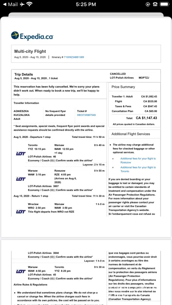 I booked flight to Poland through Expedia. The flight had been cancelled on July 7, 2020. I have not received refund yet. I was supposed to receive a refund within 12 weeks of the cancellation. It has been 26 and no refund of $1082.42. I have been calling Expedia every month and received same answer that the Lot airline delayed credits. I called Expedia on Dec 23 and the agent told me that I should receive refund at the end of the month. Since I have not received it, I called Expedia again on January 8 twice and agent Mike told me that I ‘am supposed to call Lot myself asking them for the refund. I did reach out to Lot and agent Sonia texted me (I attached the copy of the conversation) refunds of tickets purchased via agency are processed by the agency. I have also attached my ticket and the picture of the conversation with Expedia who can't find my bookings now.
