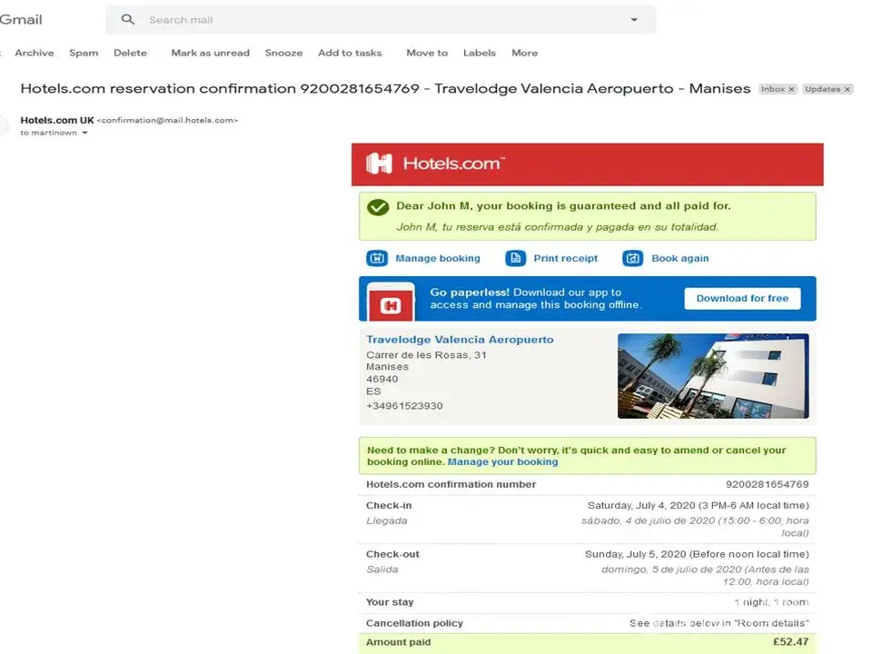 Hotels.com reservation confirmation [protected] - Travelodge Valencia Aeropuerto.