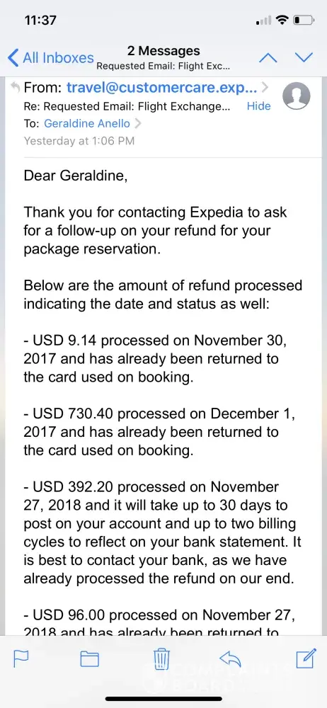 I have written them since, and they keep saying it was deposited to my bank account. However, my bank has no signs of this. Expedia also never sent an email confirmation of having sent that refund, like they have for other refunds.