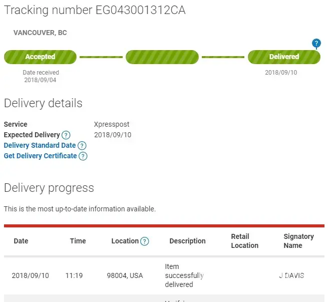 Canada Post tracking shows it's been received and signed by "J Davis" on September 10, 2018 and so far I have not received any answer from you.