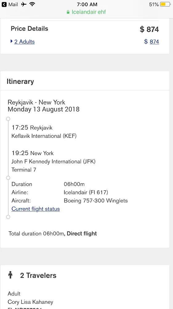 On May 13 2018, I purchased two Icelandic air tickets for my son Derek and I from your site KEF-JFK departing August 12, 2018 @5pm.