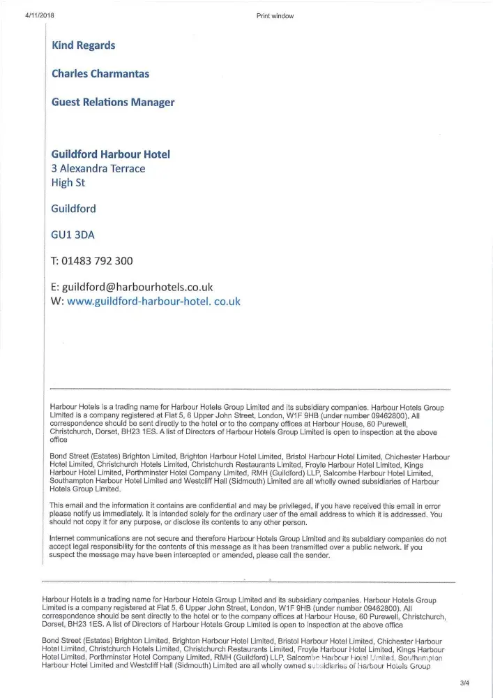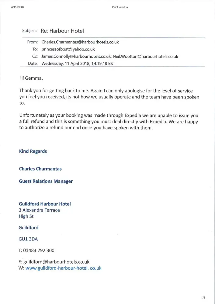 I recently booked a hotel through yourselves The Guildford Harbor Hotel ref [protected]. During my visit which was Saturday 7th April I did not receive the service I expected from a 4 star establishment. I have been on communication with hotel guest relations manager explaining my complaints. Our refusal entry to the hotel pool. The fact that the room equipment was not working i had to wait over 30 minutes for replacement and that took 2 phone calls down to reception. The next morning on check out I got a shrug of the shoulders from reception when I explained. Now the manager is aware that our visit was a special occasion and that a revisit is not viable for us I asked for a refund hes said we had to go through yourselves but he will sanction it his end. I have the emails to verify this which I will attach