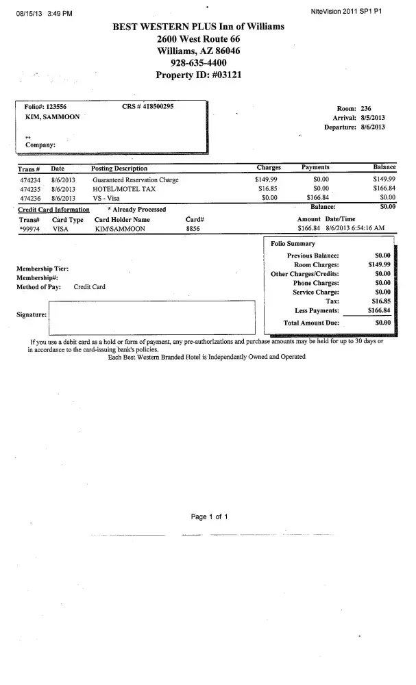 Best Western Puls Inn of Willams(Arizona) charged the amount of $166.84 to my credit card account.