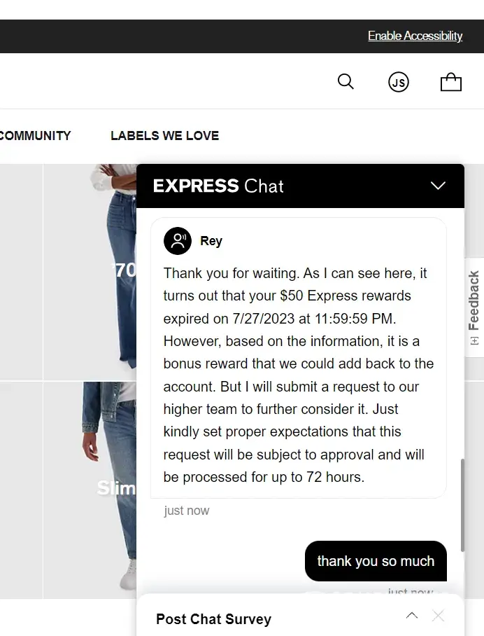 I have lost my $50 rewards due to the Express website issue. The next day when I try to use it again, then the reward was gone due to it's expiration date was the tech issue day. I can't place order that day. Then I contacted the customer service, they said they are going to add the reward back to my account, however, it never add back.