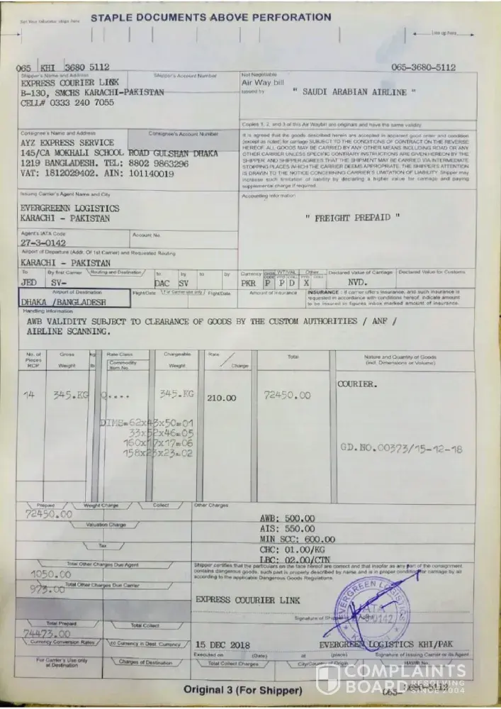 with reference to the above mention AWB no i want to bring in your kind information that we deposited this CARGO on 15th of November for KHI to DAC. Same day flight departed for JED and till the date, it's offloaded which is badly affecting on our business.