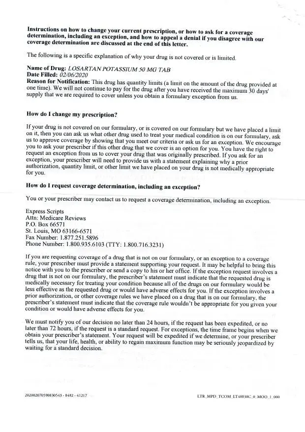 The formulary list Losartan as a covered drug with limits on qty. I take 2 per day at 50mg. They continue to harass my doctor for an exception as to why it can't be 100 mg once a day. (90 pills for 90 days instead od 180 pill for 90 days. Why should I have to break a pill to comply with how I am supposed to take it? I have written two letters to their Medicare Review Dept per their instruction and also faxed them to the number they provided. They now claim never having received them.. It's a lie. Can you help me.
