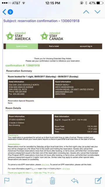 I had a reservation (#[protected]) to stay at your San Jose location on Saturday 8/5. We showed up at 5:00 to check in. The front desk said that the room was not ready and to come back in about an hour. We came back around 6:30 and the room was still not ready. The receptionist told us that the cleaning staff had quit and no rooms were available. She suggested we go try to find another hotel. In a panic, I called numerous hotels in the area but they were all booked. We had no place to stay. I went back and explained to the receptionist that we had no where to go. She then went to clean a room. We got into our room at 11:30 pm. I have never experienced anything like this at an Extended Stay which we have stayed at on many occasions. I am hoping you will credit our entire room for the inconvenience you had caused. I have attached my invoice.