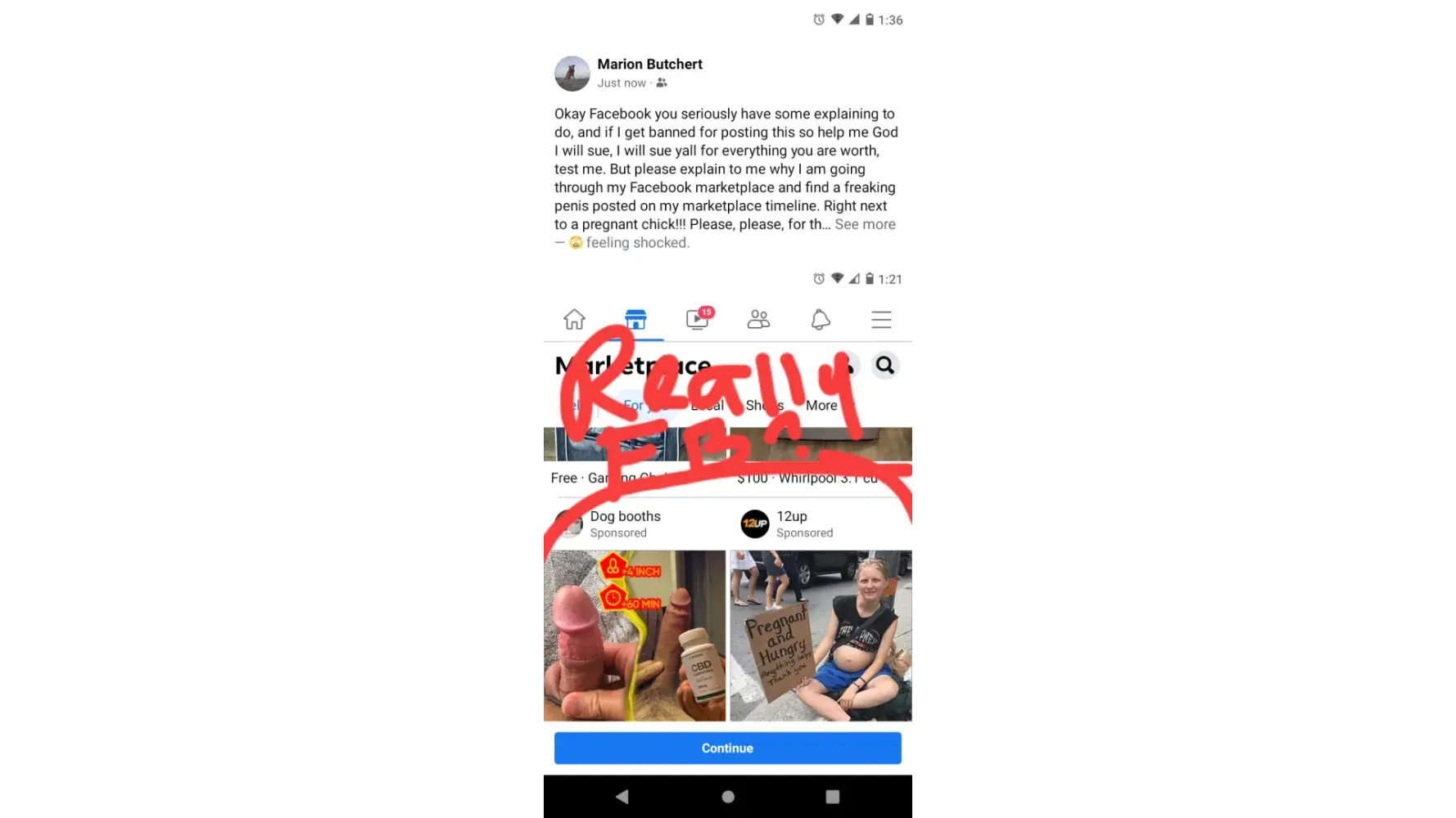 I was coming through marketplace looking for building material, I typed free in the search bar and begin my search. As I scroll through my Facebook marketplace feed I got an advertisement for CBD the displayed two pictures of the men's private area. I screenshot it tried to get answers from Facebook and got banned. I'm extremely upset that something like that would come across my marketplace feed. I've never searched for enhancement drugs of any sort so there is absolutely no reason why that showed up on my feed. I do not appreciate it and it is absolutely disgusting that that would come across a shopping feed, and I want answers as to why it was there in the first place. How can you allow something like that and then ban me for something ya'll allowed in the first place. How dare y'all stick other people with double standards. I only shared what y'all shared with me back to y'all to get answers. Absolutely disgusting in a very low way to operate what's considered a business. And just imagine thank God my grandchildren are not allowed to have Facebook or any kind of social media site. But I do like to let my grandchildren pick out items off of marketplace and thank God I was not with one of my granddaughters when that came across my marketplace feed. Could you imagine shopping for toys or clothing items for you, your child, or your grandchild and all of a sudden you're just getting pictures of people's private parts as advertisements? Absolutely disgusting and I want answers.. m.r. [protected]@gmail.com