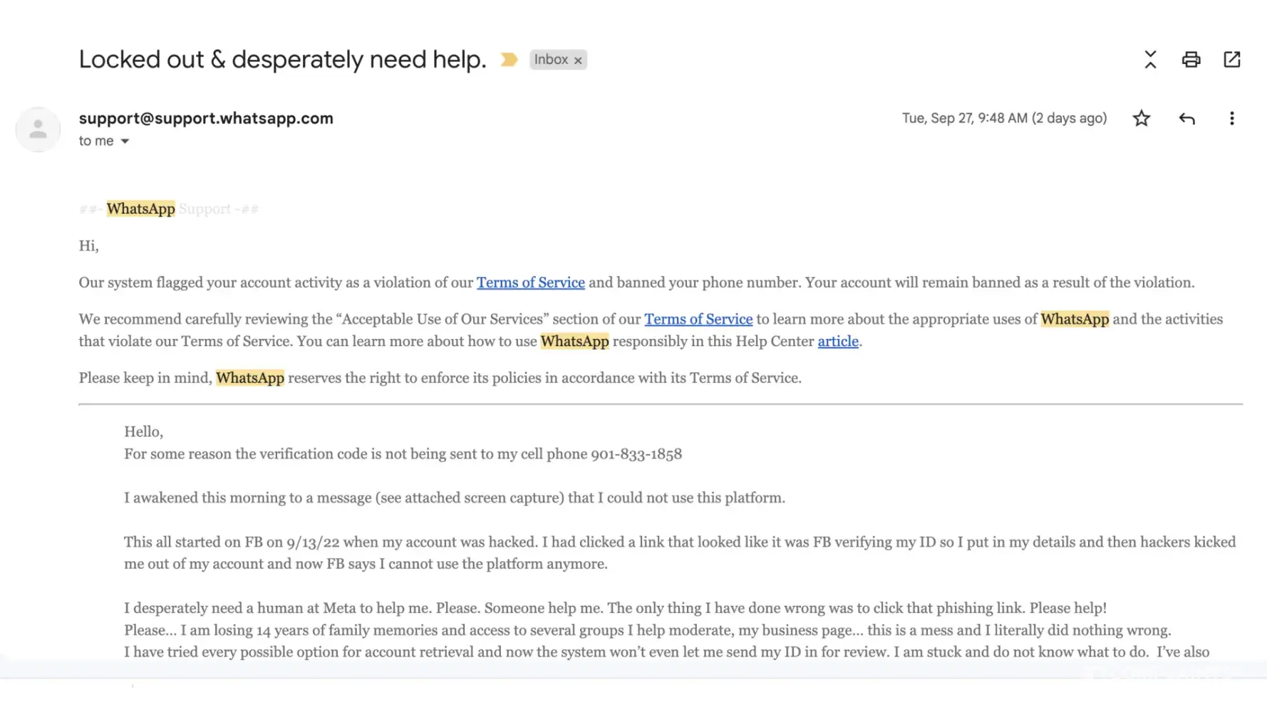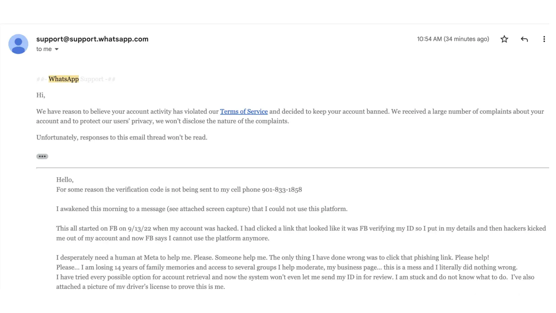 2- I emailed back and got a human response once, and then again asking for a human review. The next email from WhatsApp indicated that my number and email address are both flagged and no one will respond to me, and that was final.