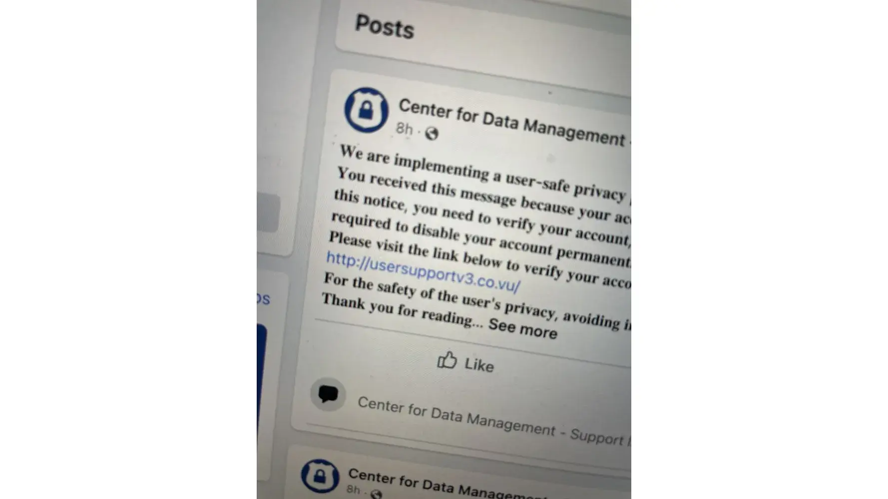 1- around 8:50 am - I clicked on a notification for my company page and found a message seemingly from Facebook (I know now it was not) saying I needed to confirm my identity to add extra security to my business page (URL: facebook.com/network.data55)
