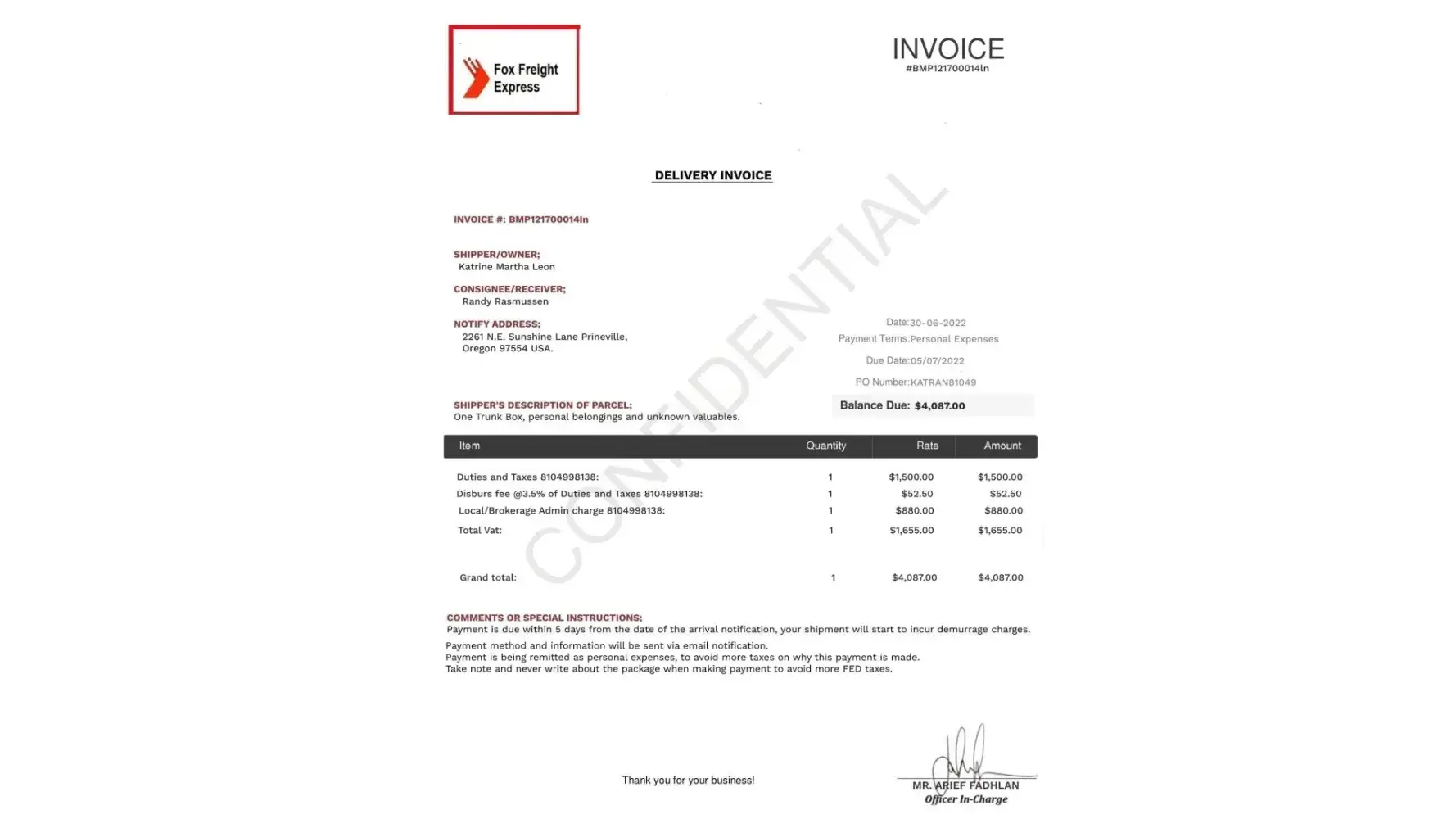This person, using this page contacted me, to be friends. after chatting she was very flirty even after being told I was married, 65, with 3 adult children. said 41 years old, lieutenant in Norwegian army and a doctor. she said she was getting out and wanted to go to the U.S. as her father passed when she was 12, not close to mother. she had lived with her aunt in Norway until the army. To her age was just a #, understood I was Married, did not care about $$, power etc. She was to get out in 3 weeks, she was in Mosul, Iraq. then she got transfer order to a remote camp in Rawa, Iraq. she emailed me a copy of the transfer letter. said she had valuables she could not secure or take with her to new location. Could she send them to me for safe keeping until she got out? I said OK as long as it was no expense to me. She sent it that day, emailed packing slips, recite for $1900.00 paid for shipping. tracking #. she left for remote station the next day. two days later I received an email from Fox Freight Express saying the package was in Indonesia and $3864.00 for tax, importation fees, var. fees. She could not pay from where she was at. when i would not pay, I was a terrible person, she ask 5 times and even wanted to ask my wife, as I told her my wife said they were probably scammers. I blocked and reported on my fb page but 3 days later she is still chatting on her fb page. Someone else checked. I have the name of an 80-year-old man who sent $3864.00 for a package being sent to him from her, after paying he was Told that customs took package because it contained a large amount of cash. It would require $47,000.00 to get it released. I know I am not to include personal information, but the fb page name is the only way to report. also, an email address she/they use in this scam is [protected]@gmail.com. They want to chat mainly on email after first fb. Thank you for ang thing you can do