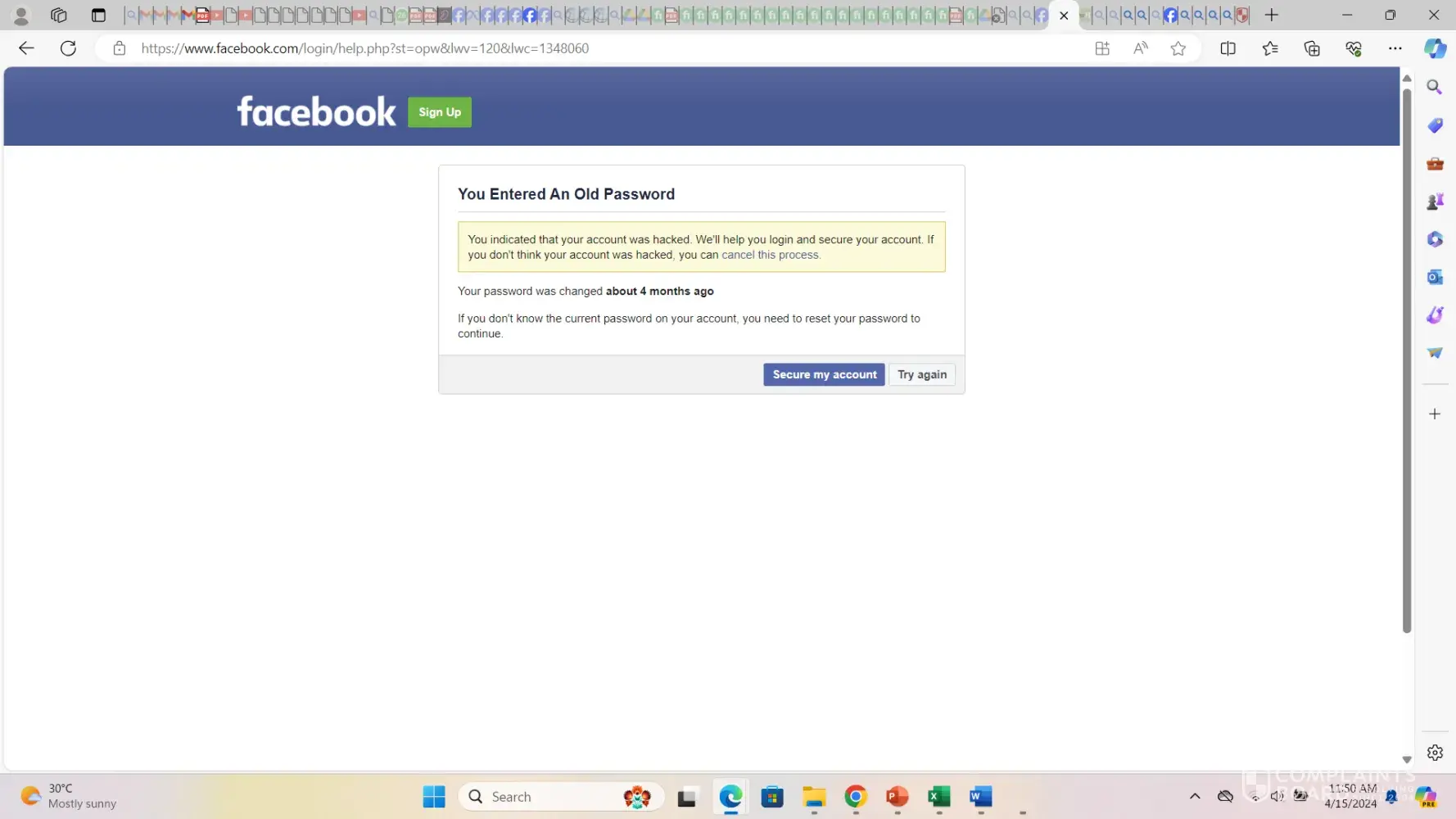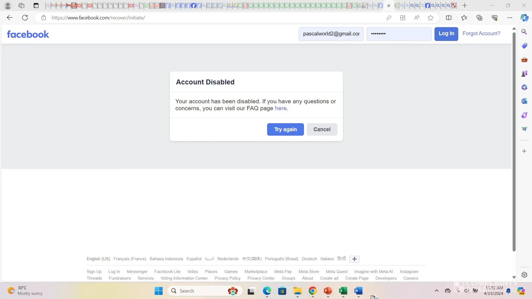 Claimed loss: Cannot log back into my Facebook account. I have reset my password, but I am unable to regain access to my account.