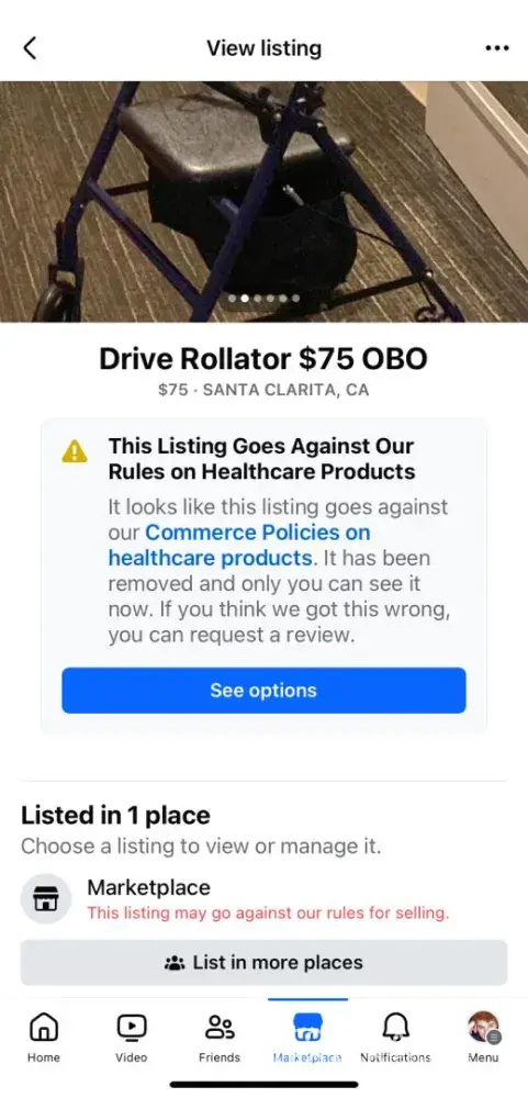 I tried to list a Rollator on Facebook Marketplace (walker with wheels), but the system keeps erroneously flagging it and saying it cannot be sold on Facebook Marketplace and that my account is in jeopardy of suspension.