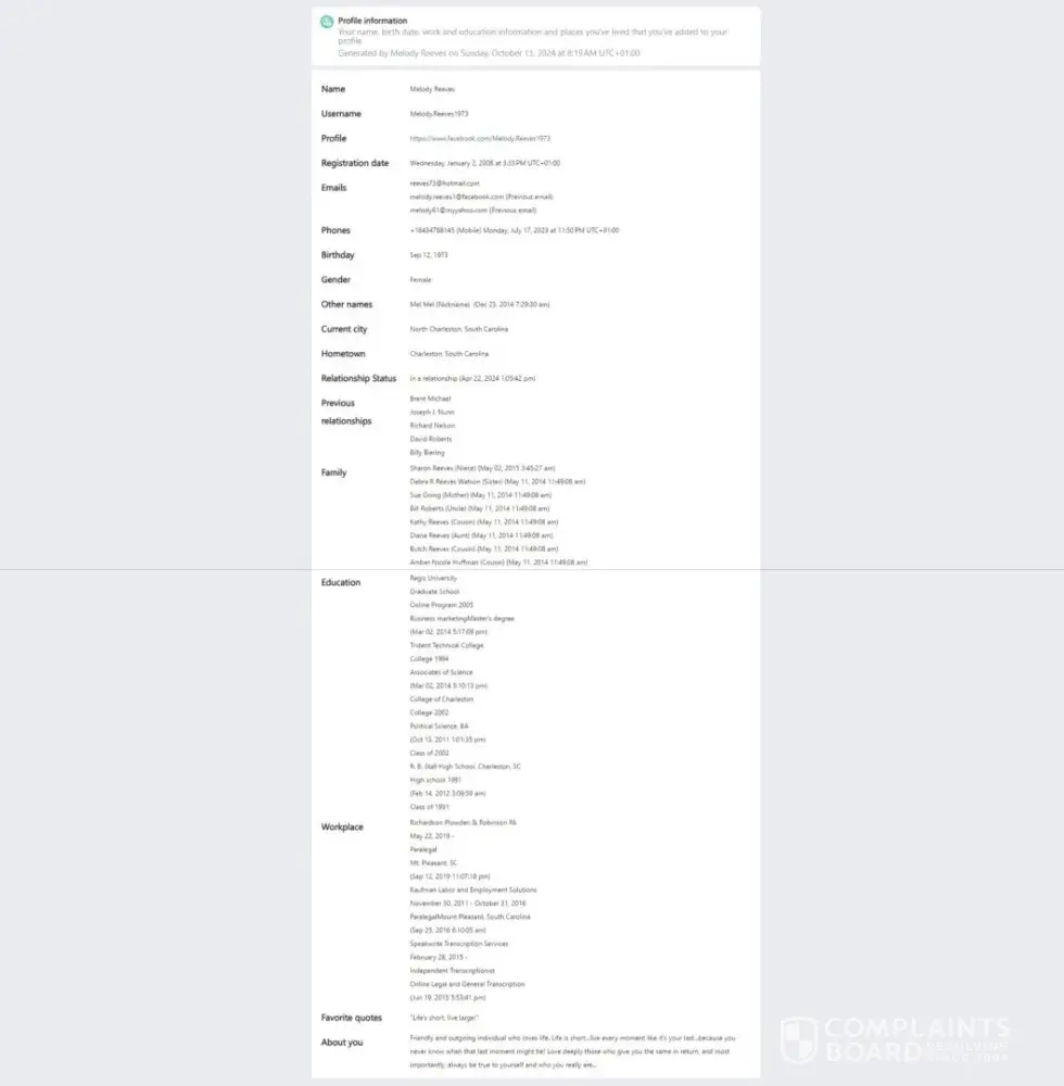 https://www.facebook.com/Melody.Reeves1973. I normally do not have to log in to my account from my devices as I am already logged in on my phone app as well as my personal computer. About a week or so ago, I was going on my Facebook account, but when I tried to open my Facebook app on my Android phone, I received a weird message, stating that my account had been suspended and was under review.