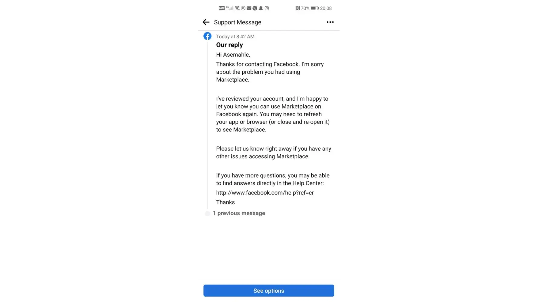 Desired outcome: I want to be able to directly verify my identity and be granted full access back to my account. Facebook should use my photo ID, my proof of address (old and new), receipt of my new phone, video call to myself.