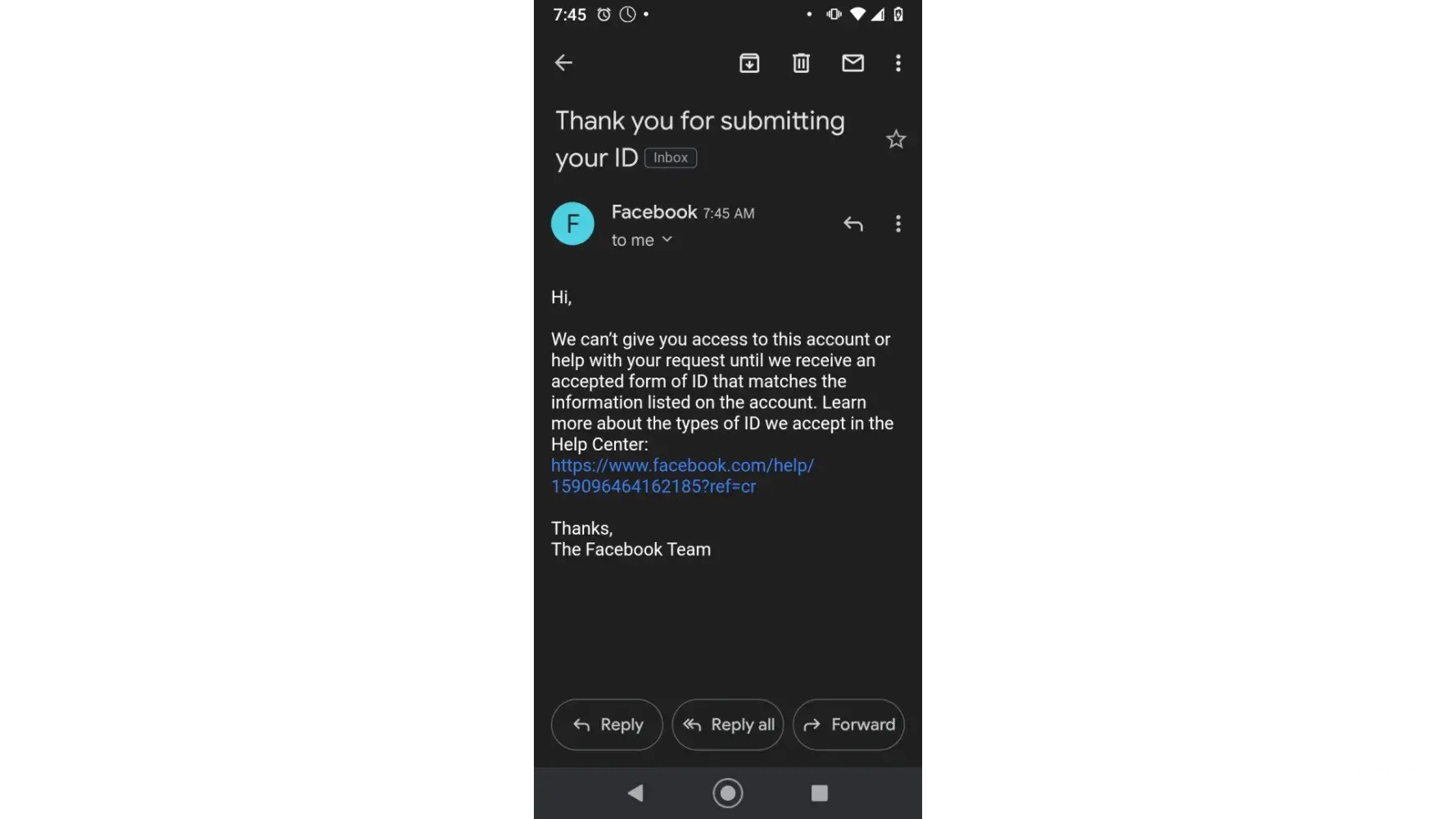 We can’t give you access to this account or help with your request until we receive an accepted form of ID that matches the information listed on the account. Learn more about the types of ID we accept in the Help Center: