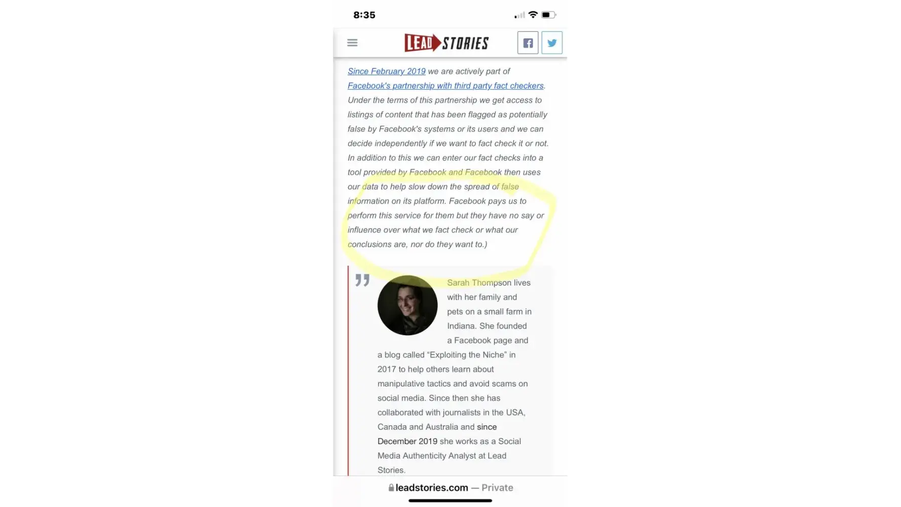 I post the following info straight from Lead stories page. Since then I am in never wnd no censorship mode of harassment and bullying. I have posted writers bio. They say I am not blocked or restricted. However, I am. This event happened as shown on photo. Sarah Thompson with Lead Stories continues to place hold on my post, restrict, or move what I post so that it can not be seen. February 7,2022 at approximately 630 am.