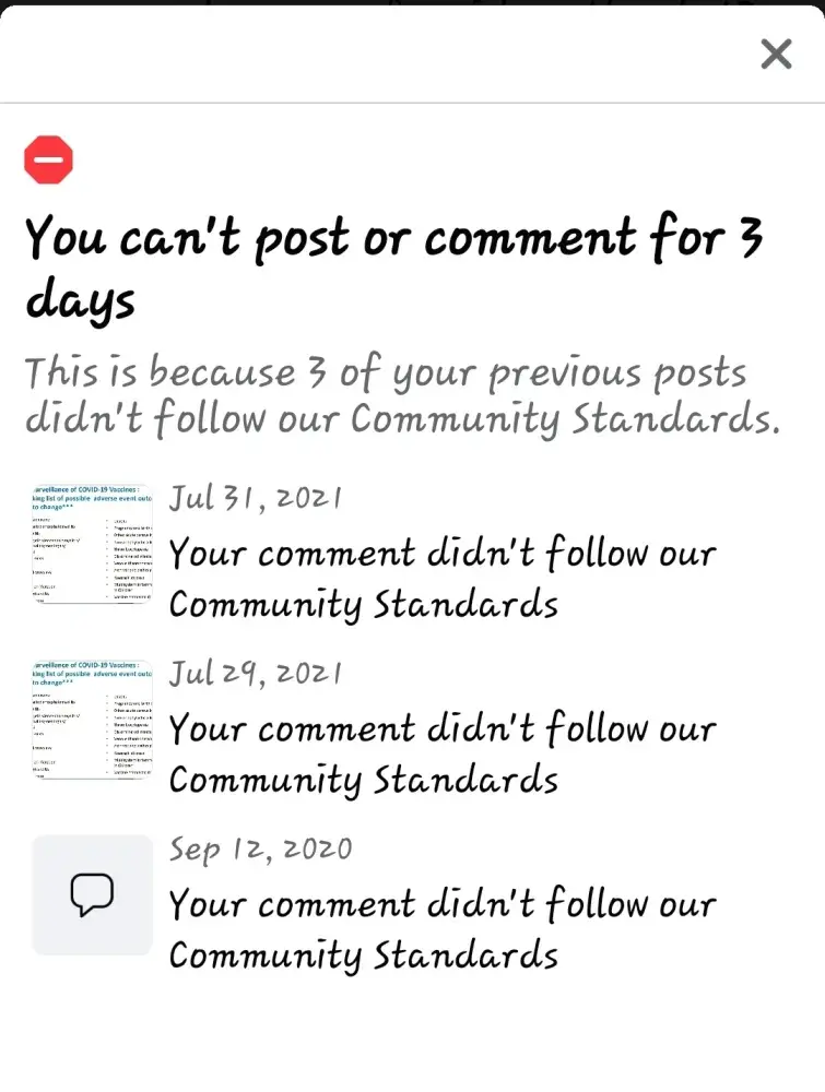 I have been suspended twice in the last week for post a slide from a CBER report concerning adverse effects of the vaccines. This slide came directly from the FDA.GOV website. Not sure how me posting FDA content goes again "community standards" or are false. By suspending me, they are [facebook] saying the content on the FDA website is false & misleading. Why suspended me for forwarding FDA content other than for the purpose of censorship & suppression of information?
