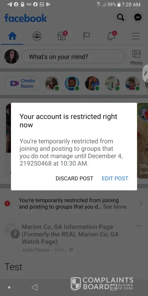 Today, I was given notification that some features had been disabled for me with no violation noted in my support inbox. When I gave feedback on the notification, I then was given a popup that my commenting or posting in groups was disabled until December 4, 2021. I have no previous violations and now no notification of what violation I have committed. Ive never been an abuser of the platform and in fact I report those who abuse or are fake accounts. I think it may be a mistake and I am asking for this to be resolved. I am a leader in my community and need access to my citizens. Thank you.