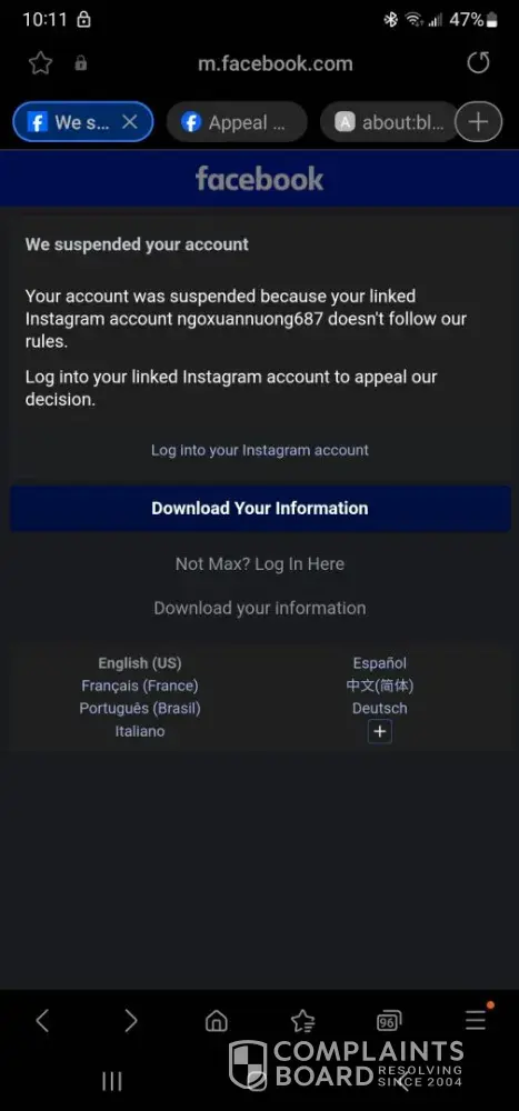 it will not let me log into facebook to resolve this issue so can you let me know how i can appeal/explain and be given more information on this matter please?