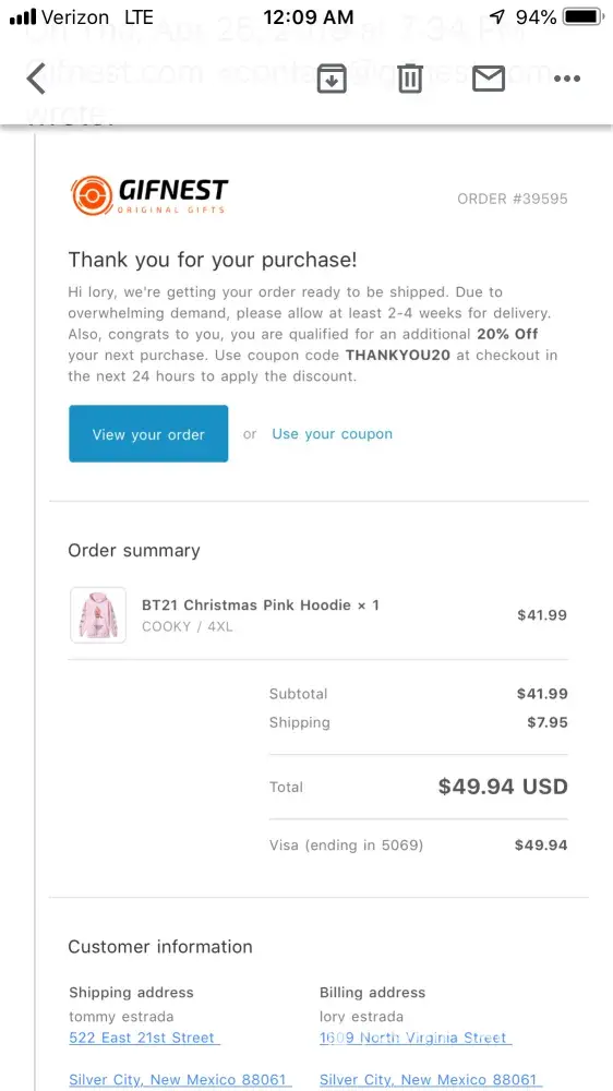 I bought a item from this company on April 25, 2019 It was a BT21 Christmas Pink Hoodie $49.94 All they tell me when i ask them about the item is it takes time for forign company to process and i asked them bunch of times and get the same answer I have asked them on website and email when can i recieve it or ask for refund i have not got nothing as of today from them