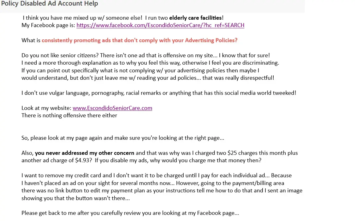 I run a FB page regarding my business which are 2 Residential Care Facilities for the Elderly (RCFE) FB page EscondidoSeniorCare//Daniel Malchow DC. Told account was disabled stating I consistently promoted ads that don't comply w/ Ad Policies and unsafe. However, I was charged $54.09 charges this month for ads...yet they disabled my ads. I inquired and have been told 4X now my ads won't be re-enabled. I use no vulgar language, porn, racial slurs etc. It's about taking care of seniors citizens... Here is contact info from FB ads team email: case++aazsa6bvs7x7cj@support.facebook.com. They won't explain how my ads are unsafe or offensive and they won't address my concern of why they charged me when I haven't placed an ad for several months... I've been unable to remove my credit card from FB and I don't want it charged any more. This is all in the past 14 days. I feel disabling my FB account is dicriminatory b/c they would not explain what was offensive. Attached copy of CC charges and 2 email contents.