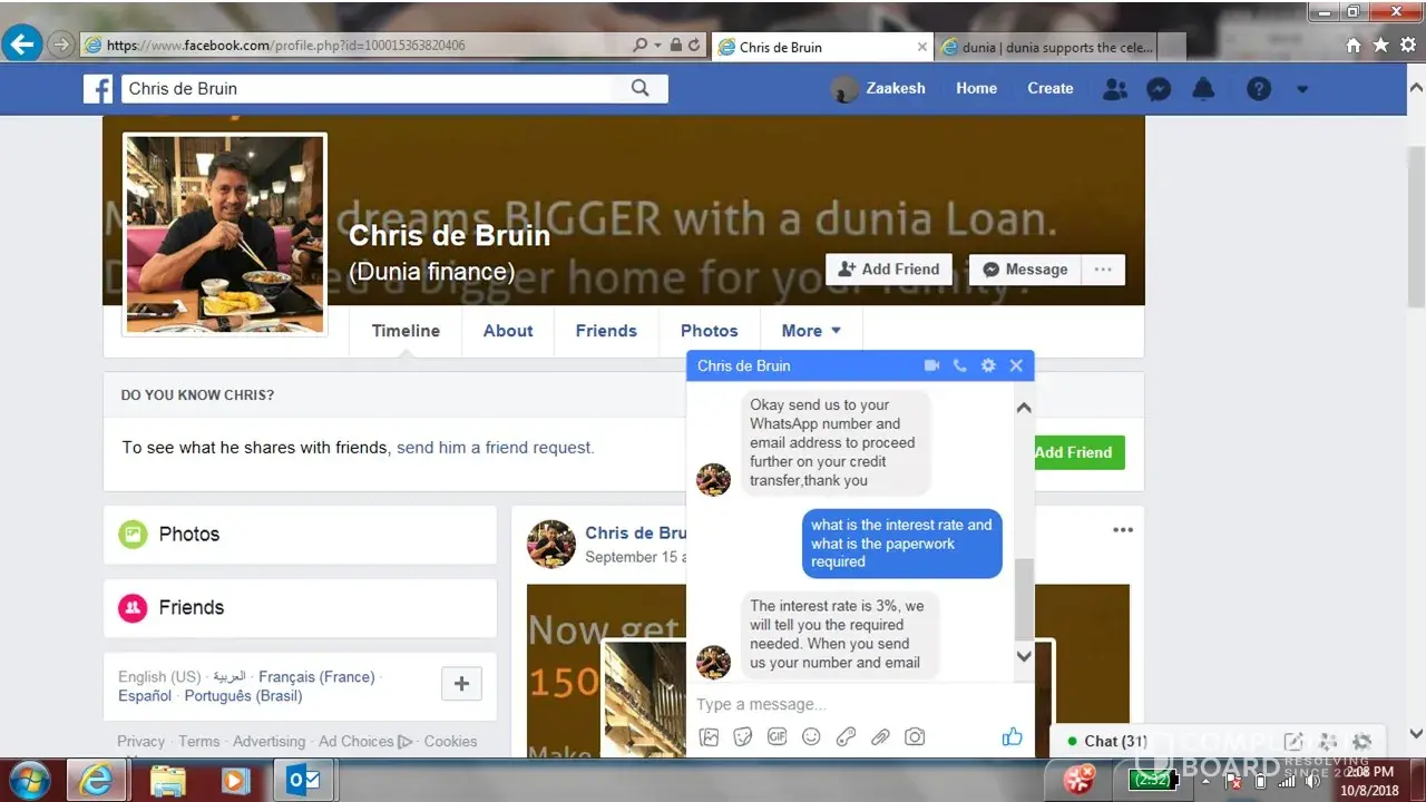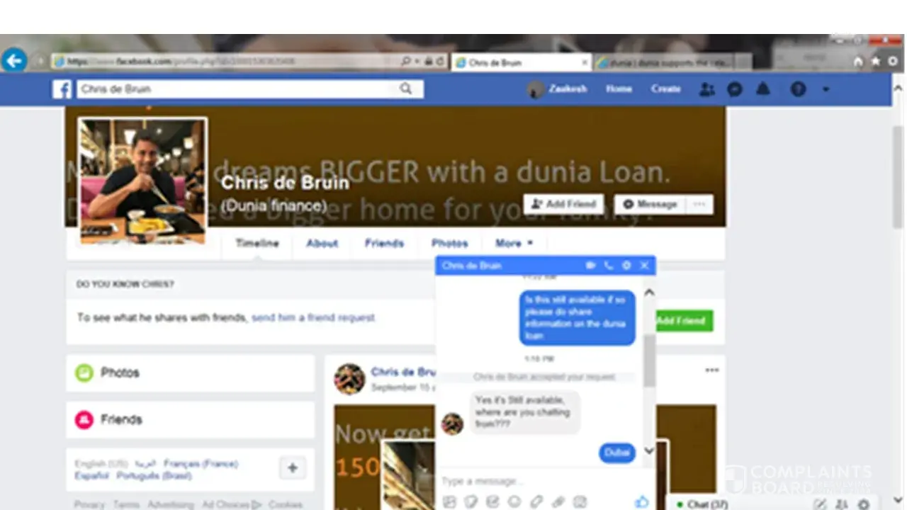 We have recently noticed that a user on Facebook by the name of Chris de bruin has been posing as our CEO and offering people loans (https://www.facebook.com/profile.php?id=100015363820406).