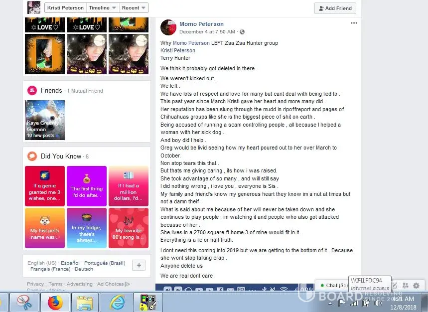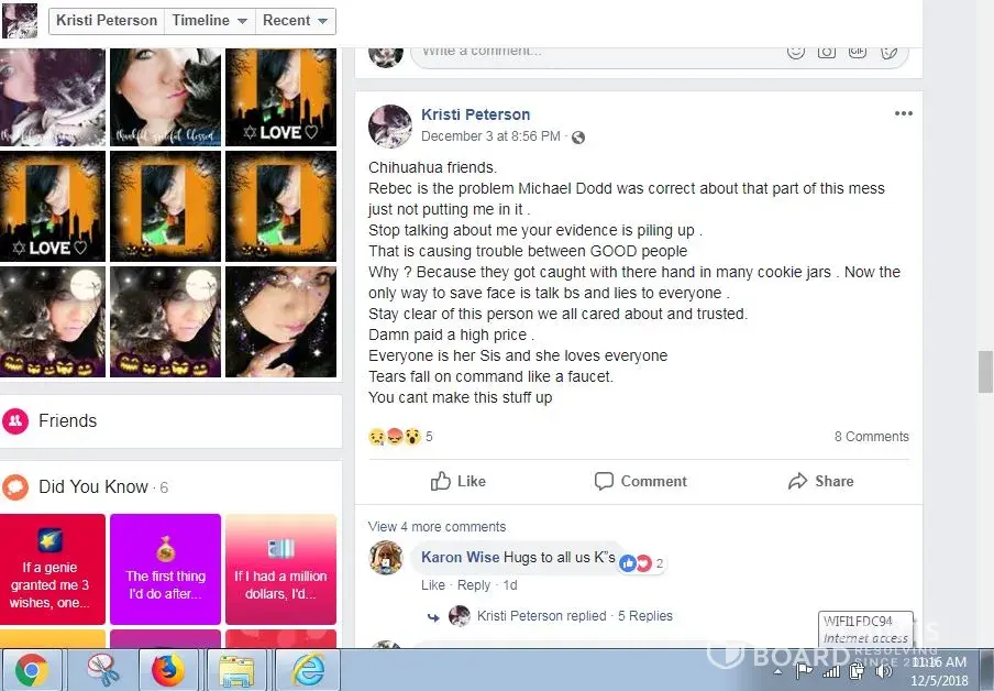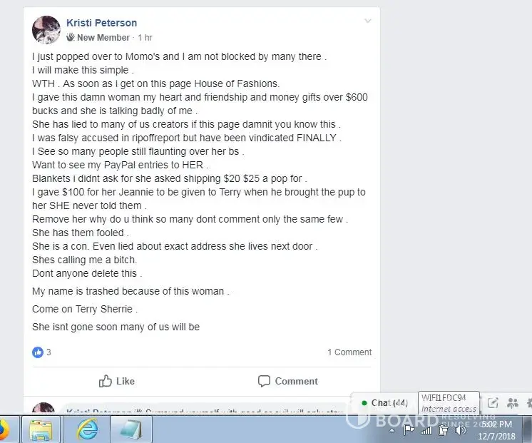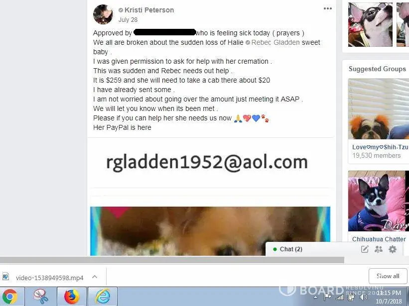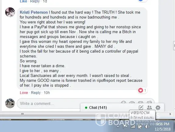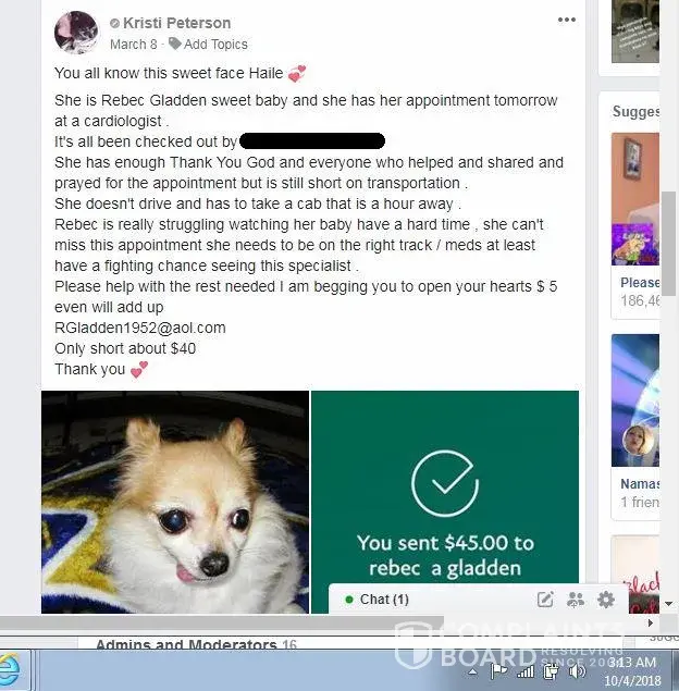 Please be careful who you donate to on face book on these bleeding heart scams we advise only donate direct to Vets or a local charity you can trust where your donation goes, several people today use face book as a avenue to seek fraudulent funds collection.MaryAnn Moller not only helped Rebec Gladden pull off several fraud scams she also abuse & neglected care for her own dogs also, She had three recent dogs that past away, She helped in the taxi cab collection scam, Rebec Gladded can not provide a receipt for this and is doing her best to cover up this scam, Cab companies have been called. It is one thing to help others dog to collect funds on a sick animal which this was a legitimate campaign, although them wanting others to pay for Rebec Gladden & Halies ride to the Vets office was another. This was where the Pay Pal collection scam begin also involving MaryAnn Moller & narcissistic sociopath lying Kristi Peterson to help collect on cab fares money was never use for a cab. Keep in mind Rebec Gladden had neglected signs of congestive heart failure on Halie so long and really allowed her to suffer waiting the last minute to get her treated & the was all because of a very kind hearted man allowing the first & second legitimate campaigns in his Chihuahua group on face book he did confirm with us those was legitimate fund raiser campaigns as he called those Vets to confirm these. Also he did confirm other collection by MaryAnn Moller, Rebec Gladden & Kristi Peterson were indeed scams & having proof and a victims list from those Pay Pal scams, They also make up false stories and attack him now for uncovering these scams thru a group audit of post and witnesses coming forward, MaryAnn Moller, Rebec Gladden & narcissistic sociopath lying Kristi Peterson are your typical scammers