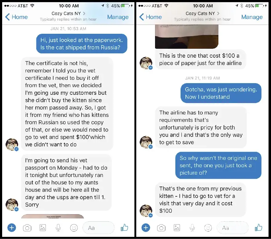 • sent me fake pictures and videos of my kitten (She has now taken down the post with the kitten she told me she sold but I took screenshots of everything *picture comparison attached (Her picture on the left, the kitten I received on the right)