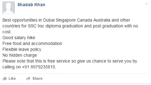 ‎I would like to inform about this fraudster Shadab Khan while enquiring about work visa. He is totally fake. He will get all your details and ask you to pay some 5000rs to the paytm wallet. He is totally fake. He will say having tie up with naukri, times job and all. Don't ever believe him and lose your money.
