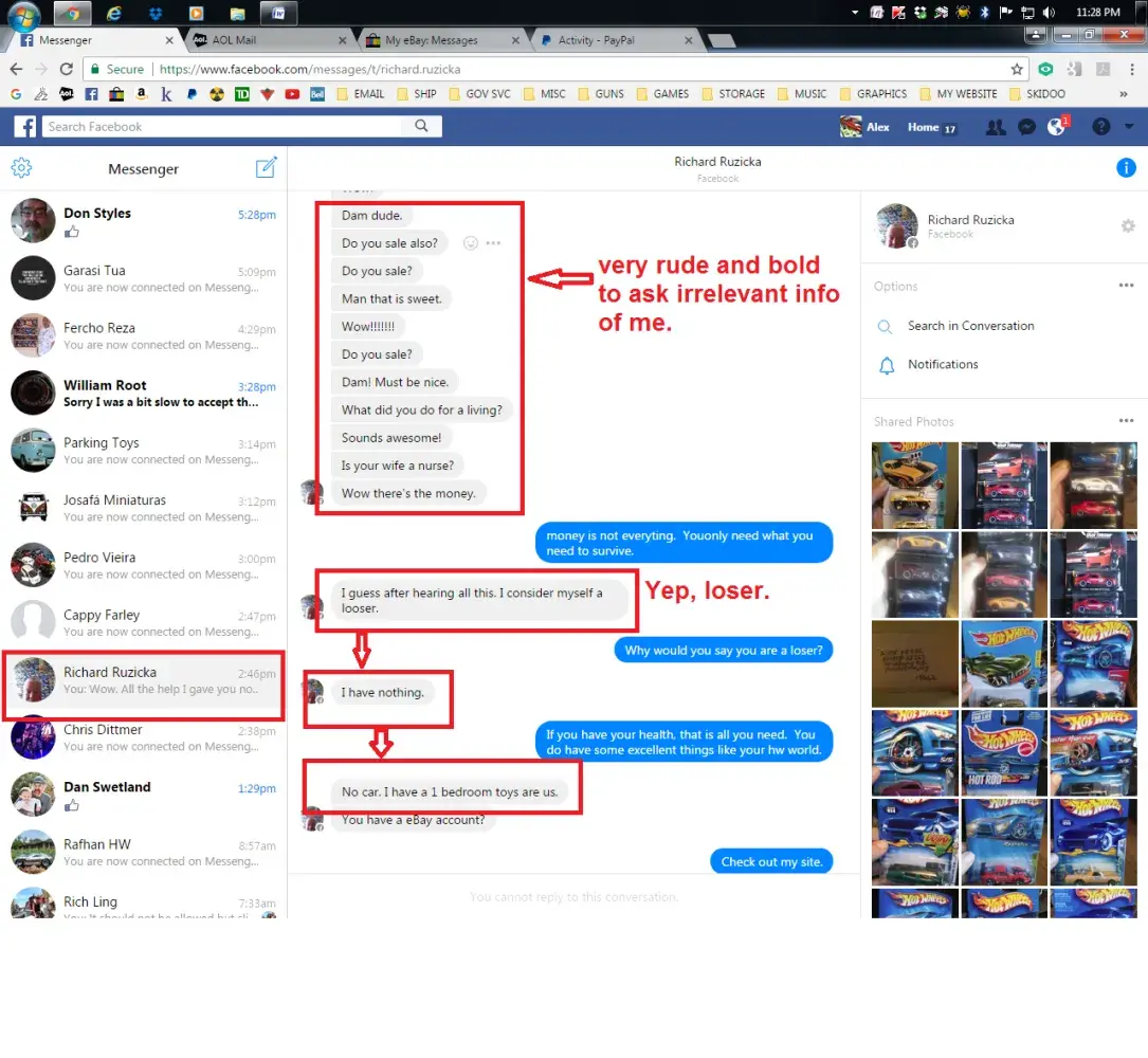 After I stayed firm on paying Sunday, he went completely ballistic, insulted me with profanity and started to further make up lies in his facebook and of course block me like the coward he is, so that I could not defend myself. He has further made libelous comments against me for everything that he caused. I intend on filing complaints with BBB in Omaha, and with other online orgnizations that defend buyers against fraud. I was warned by many people that Richard Ruzicka has a serious problem with communication and makes demands. I gave him a chance to be fair with me, and he screwed me out of 1.80$ I tried to get him to come clean with Paypal and send me the money and he posted a message on his facebook that he will not refund me.
