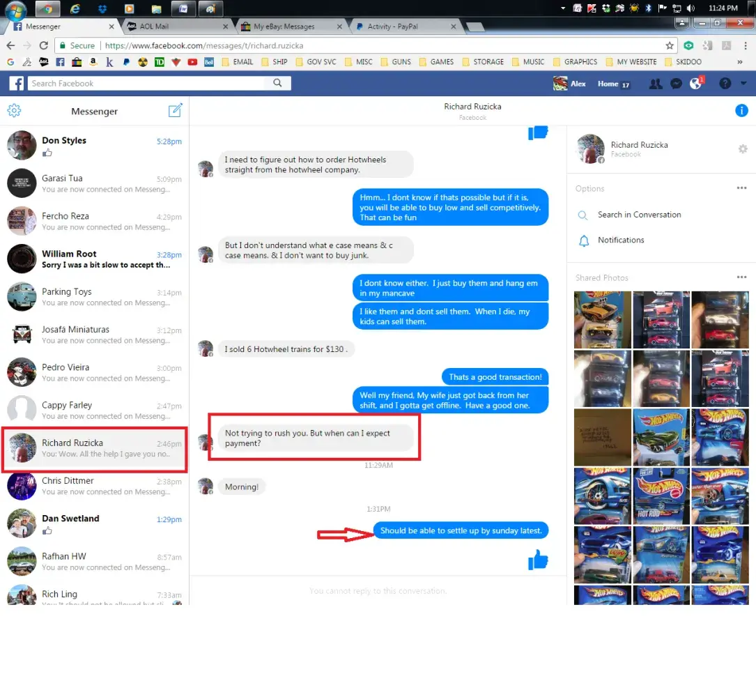 Over the last 2 months, I made 2 purchases with Richard Ruzicka from facebook and from youtube where he posts his Hot Wheels for sale. Richard has a tendency to want to be paid immediately yet only wants to ship 5 days later. I was told by over a dozen members not to do business with him because he would go bipolar on me. I give everyone a chance and his proved true to the warnings.