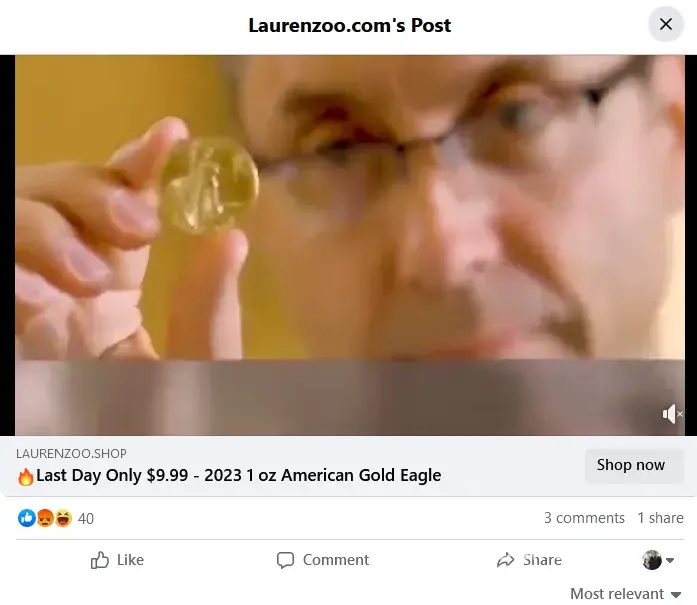 Facebook is generating ad revenue from companies selling fake coins and bullion. Facebook is profiting from these crimes. Facebook is refusing to take down the ads. Facebook is therefor complicit in federal crimes. Facebook is facilitating the rip off of millions of people around the world by feeding these ads into peoples private stream. Facebook has not responded to hundreds of flags on ads that are obviously for fake products including those that claim to be from the US MINT.