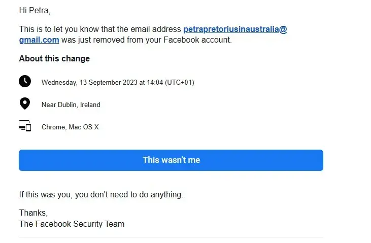 Wednesday 13 September 2023, my Facebook account was hacked by someone in Ireland. The hacker changed my password as well as my email address associated with my Facebook account to his email address. I have done everything I could to get my Facebook back, with NO luck at all. I have send a lot of emails to Facebook with the attachments with NO luck. I have saved photos of my children in my Facebook account. It now looks like my Facebook account is disabled. Please help me. I attach all the information that I have.