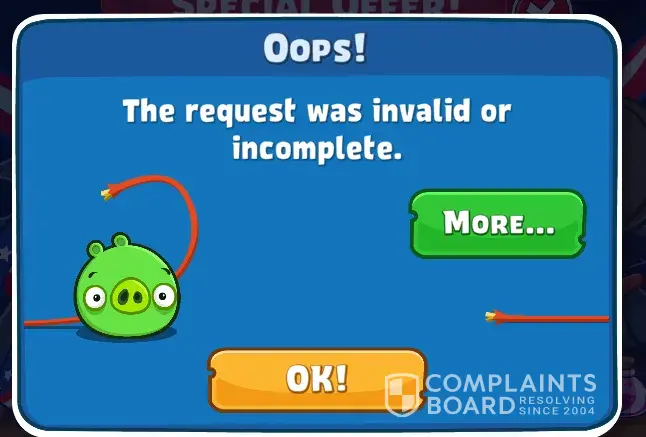 For the past month while playing Angry Birds, I've tried to purchase power-up offers. I have been getting a message "No Money Was Taken From Your Account" and "The request was invalid or incomplete." That was on my desktop computer. I could make a purchase from my tablet which is a different payment method.