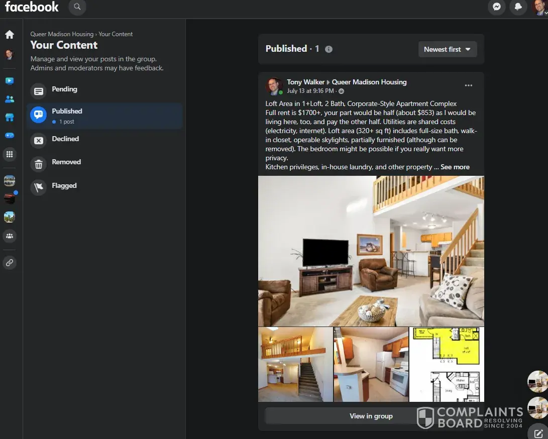 I am trying to offer a loft for rent in my apartment, but I see that Facebook Marketplace has terminated my postings. I don't recall being notified for any reason for this action. In fact, I've looked up my profile and it states that I have "no violations". Then I was able to find "my content" but almost all listings had something wrong with them so then I deleted them.
