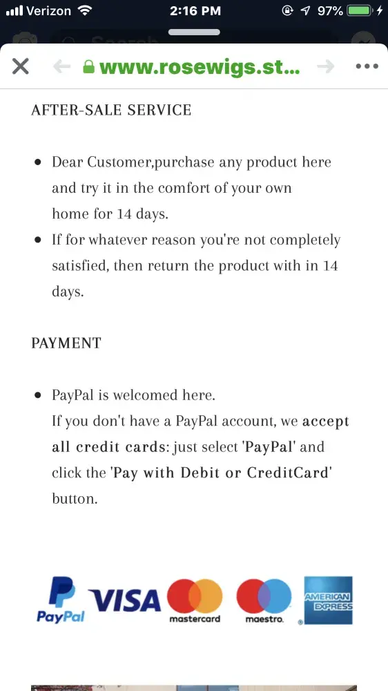 I ordered a wig and received a different one and different color...Their ad says 14 day free trial 100% money back guarantee...I contacted them several times by email and included their online ad but was only able to get a 50% refund! Why do you allow advertisers who rip you off to sell on Facebook?