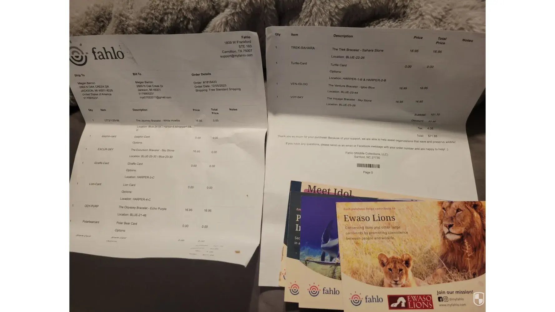 I purchased three bracelets: a lion, an elephant, and a penguin from Fahlo. I received them in a timely manner, but part of the appeal of the product was a portion of the price went to tracking animals for research purposes. Along with the bracelet I was to receive information about a specific animal, its name, and a QR code that I could use to follow their tracking. I did not receive that information for any of my bracelets. I have sent three messages on their contact line, but have received no response, and no information. I feel that I have given the company ample time to respond if they were going to.