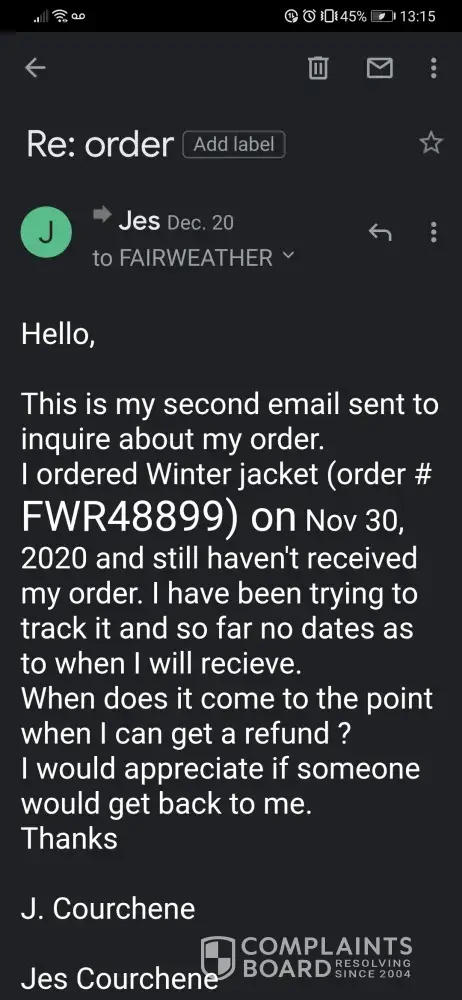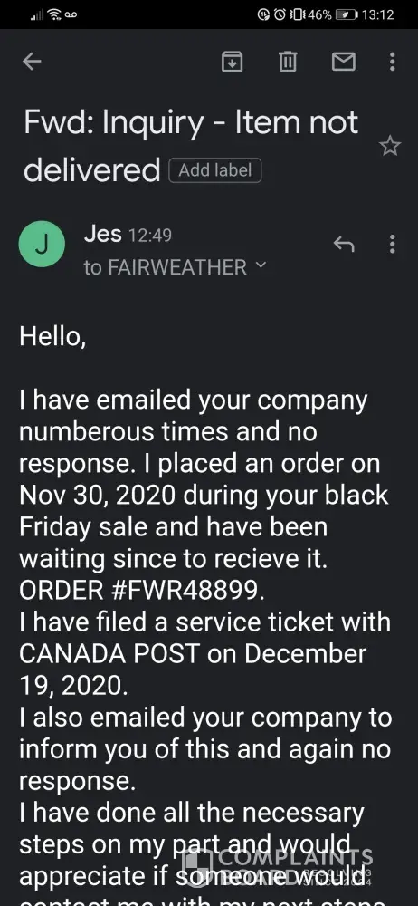Order #FWR48899 was placed on Nov 30, 2020. I took into consideration that mailing system would be considerably longer this year. After some time passed i emailed fairweather company with my concerns and again no response. I took other necessary steps and emailed Canada Post regarding issue on December 19, 2020. They informed me to wait until December 29, 2020 for further instructions. I received Canada Post's final email today stating item has NOT been delivered and to contact company associated with purchase. I have also done so.