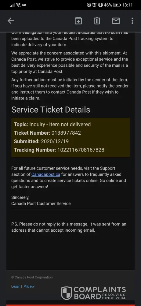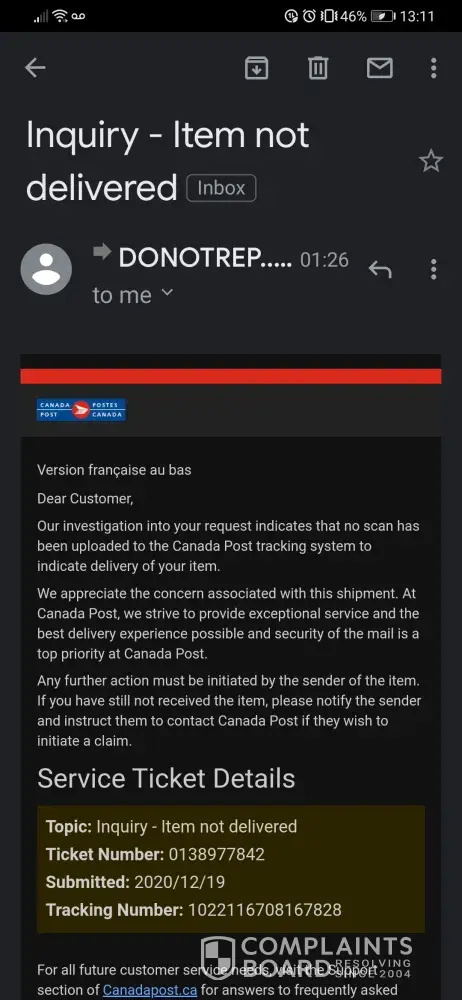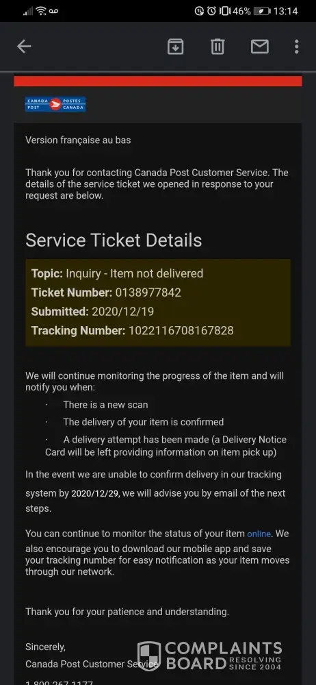 Customer Service says they have filed a ticket with Canada Post and that Canada Post is supposed to contact me.
