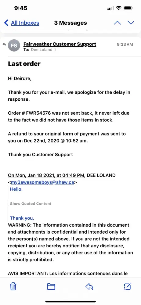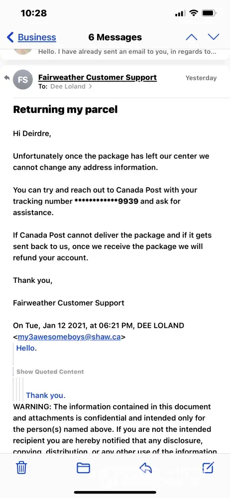 I placed on order online using my gmail account and the mailing address on that was incorrect. As soon as I realized that, I tried contacting Fairweather customer service-which could only be done via email, so I must have sent at least 10 emails , advising the mailing address is incorrect and sharing the updated address. I also filled out a form to which I received an automated email completing ignoring the original ask. I responded back to that as well advising of the correct mailing address. Then I installed SHOP to track my package and tried contacting Fairweather via the app as well. All of this to no avail. This has been by far the most frustrating online purchase I have ever made. I didn't even receive an acknowledgement of my email, resolution is a far cry! I am so disappointed that there is no customer service # to call to resolve such issues. once i found out that Canada post was the one delivering the package, i opened a ticket with them to update the address but it was too late! they said the item is being returned to the sender! my order # is FWR159401. Now i can only hope that my money will be refunded once Fairweather has their items back! The order total was close to $100. Please help!