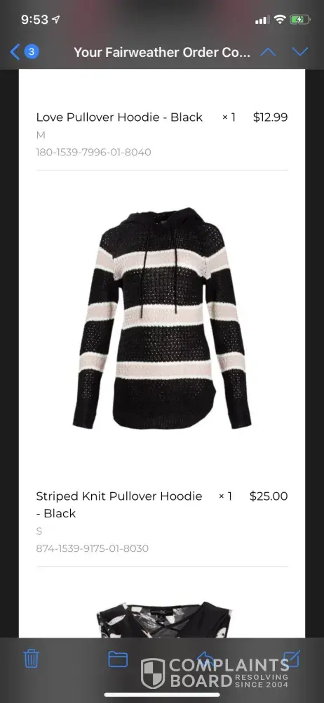 Returned clothing in July 2019 (most items you could see through) and have still not received refund of $59.88 is owed to me. Have submitted BBB report and they failed to answer to 2 attempts. Tried contacting fair weather including group multiple times and my requests go unanswered. I have tried for almost 6 months for resolution. I do not receive responses when attempting to contact them and neither did the BBB
